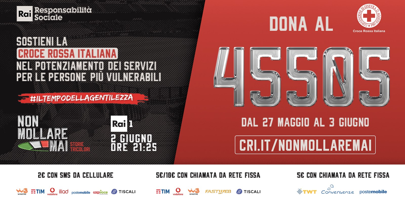 La serata sarà anticipata da una forte promozione sui social network dove, con gli hashtag #NonMollareMai e #CRI45505, i protagonisti dell’evento inviteranno il pubblico ad incrementare la raccolta fondi attraverso le piattaforme della Croce Rossa Italiana sul sito www.cri.it/nonmollaremai con IBAN, carta di credito e attraverso il Numero Solidale.