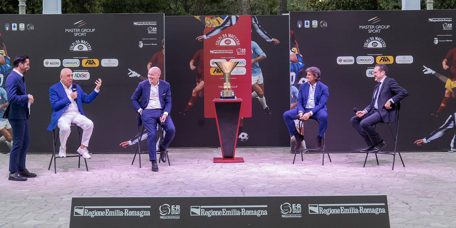 Organizzata da Master Group Sport e Adise, in collaborazione con la Regione Emilia Romagna, la serata-evento "Colpi da Maestro" ha avuto come argomento la storia del Calciomercato. Nelle suggestive atmosfere del Parco Fellini, adiacente al prestigioso albergo romagnolo, è stata aperta al pubblico la mostra inedita COLPI DA MAESTRO: 70 anni di storia del Calciomercato (1950-2020), patrocinata da FIGC e Lega Serie A, al termine di una stagione che ha visto la Regione Emilia-Romagna assoluta protagonista della ripartenza sportiva del Paese.