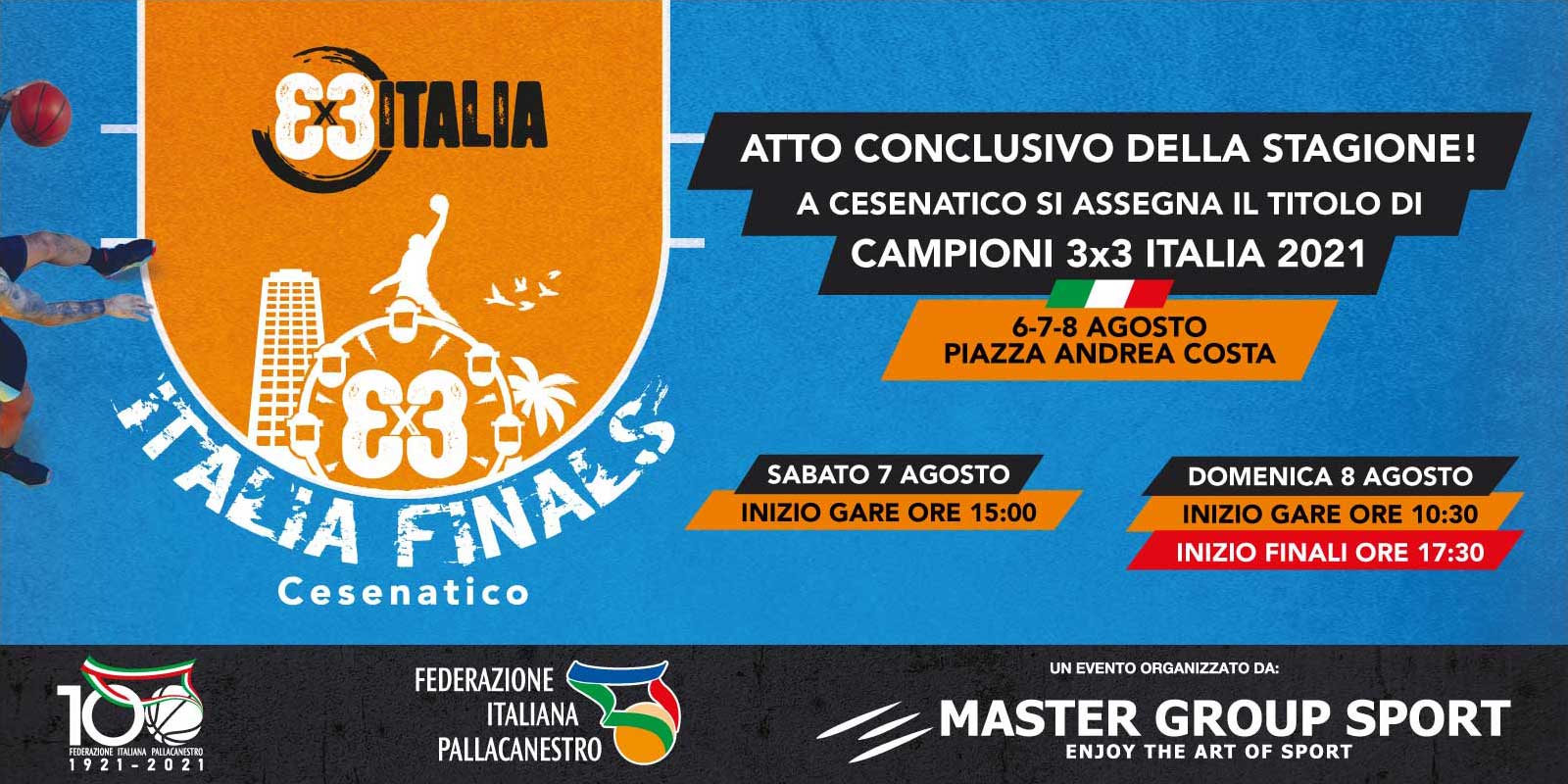 La regione Emilia-Romagna apre le porte ad un altro grande evento sportivo in una stagione che l’ha vista assoluta protagonista della ripartenza dello sport italiano. Dal 6 all’8 agosto, Cesenatico apre il suo luogo simbolo, Piazza Andrea Costa, alle 3x3 Italia Finals, il gran finale della stagione del 3x3 Italia FIP Circuit, l’unico circuito di tornei di basket 3x3 sotto l’egida federale, organizzato dalla Federazione Italiana Pallacanestro e Master Group Sport.