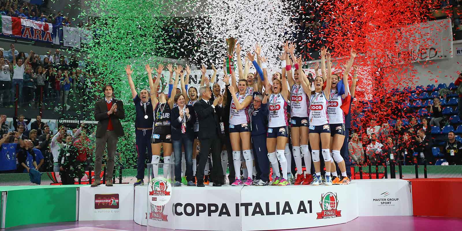La Igor Gorgonzola Novara è la vincitrice della 37^ Coppa Italia di Serie A1 Femminile. Al termine di una partita favolosa, probabilmente la più bella della stagione, le azzurre di Luciano Pedullà battono 3-1 la Liu Jo Modena e conquistano il primo trofeo della 'nuova' Agil, passata in tre anni dalla Serie B2 alla vetta della pallavolo italiana. In un 105 Stadium sold out - 4.300 spettatori e clima infuocato - sfida spettacolare, con improvvisi e imprevedibili cambi di fronte. Novara sale 1-0 e 24-20 nel secondo. Quindi la poderosa rimonta delle bianconere di Alessandro Beltrami, che capovolgono le sorti del parziale con una pazzesca Francesca Piccinini (22 punti, 11 solo nel secondo set), imponendosi 30-28 e portandosi sul 24-22 nel terzo. Qui sono le piemontesi a rinascere e, in un susseguirsi di grandissime emozioni, a vincere 30-28. Nel quarto lungo tira e molla, con Novara che si porta 23-20, subisce il rientro delle bianconere (23-23) ma con un'infinita Katarina Barun - premiata MVP del match con 31 punti e il 46% offensivo - ottiene i due punti più importanti della sua storia.